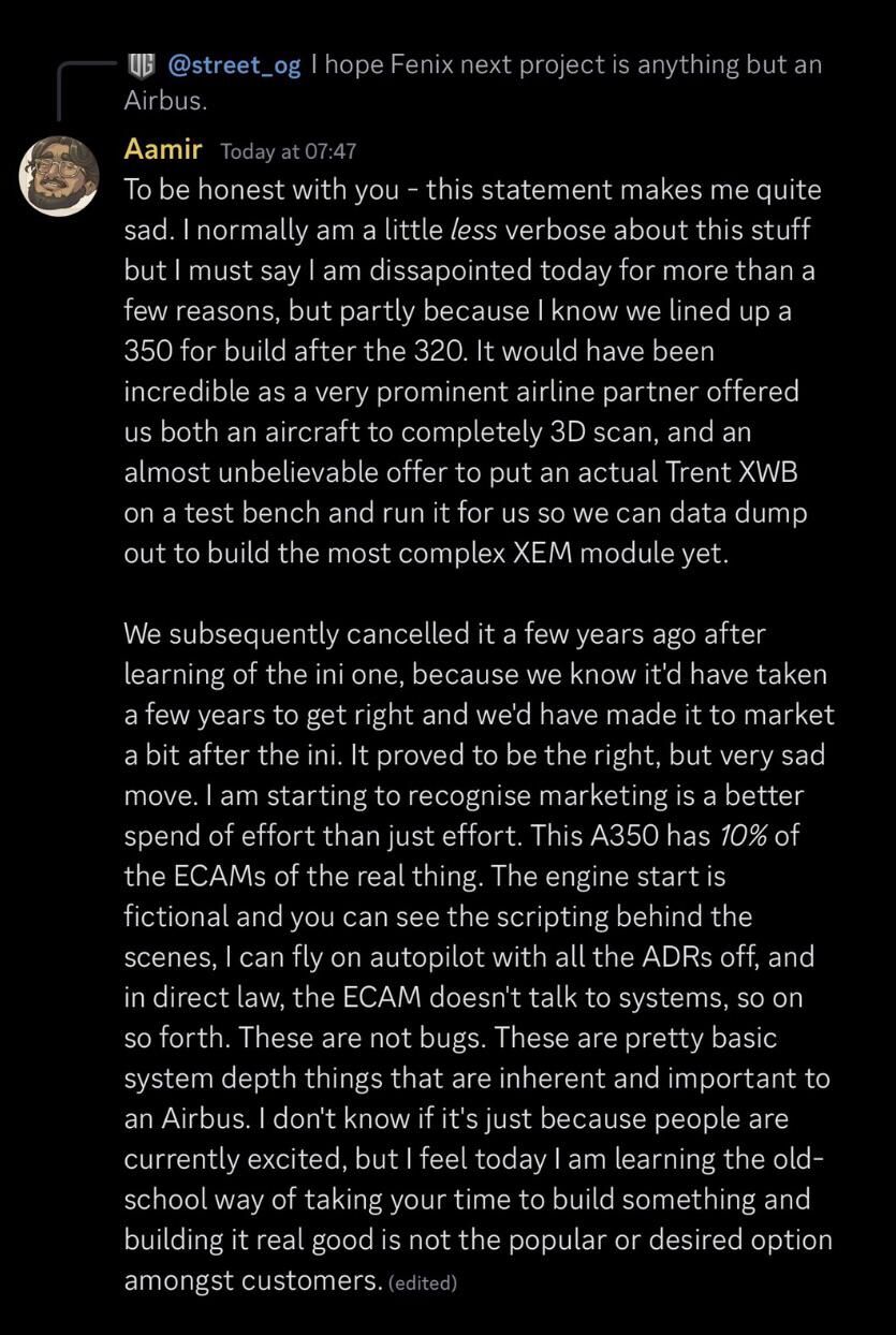 FalconJockey Geschrieben 28. Februar Geschrieben 28. Februar Es gibt doch genug Hardcore-Simulanten. Warum wurden die nicht für die Tests des Produkts eingeladen? Ja, kostet vielleicht ein wenig Geld, aber das ist um ein Vielfaches reingeholt, wenn man sein schlechtes Image ablegt oder gar nie einholt. PS: Übrigens die Reaktion von Amir (Fenix A320) ist ziemlich ernüchternd: Ich behaupte mal, dass >80% der A350-Kunden den ini-Scam wegstecken werden, weil sie sich gar nicht für eine solche Systemtiefe interessieren. Sobald iniBuilds das Flugzeug soweit gepatched hat, dass Autopilot und Flugdynamik okay sind, wird es zur Abandonware, so wie die früheren Produkte auch. Die Leute kaufen es trotzdem. 1 Zitieren